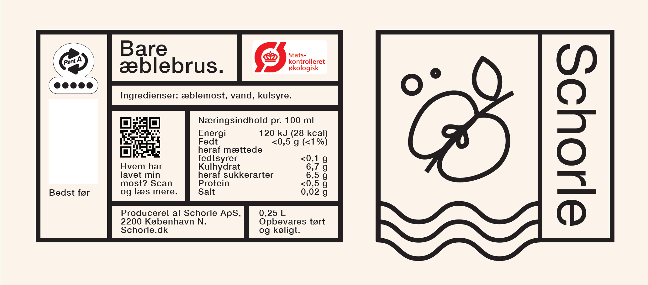 A clean, straight-forward design for an accessible & fun brand. The owner wanted a minimal design that reflected the three simple, ecological ingredients in the product. Water, CO2, and ecologically farmed Danish apples.